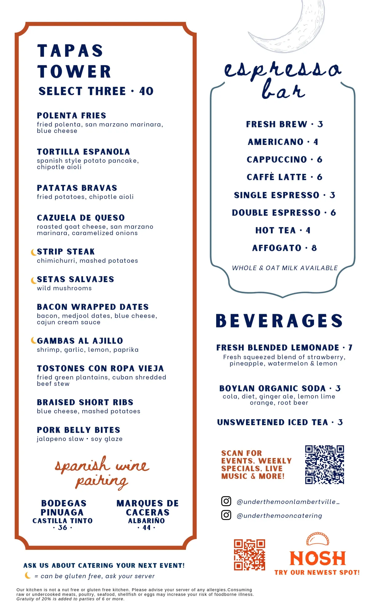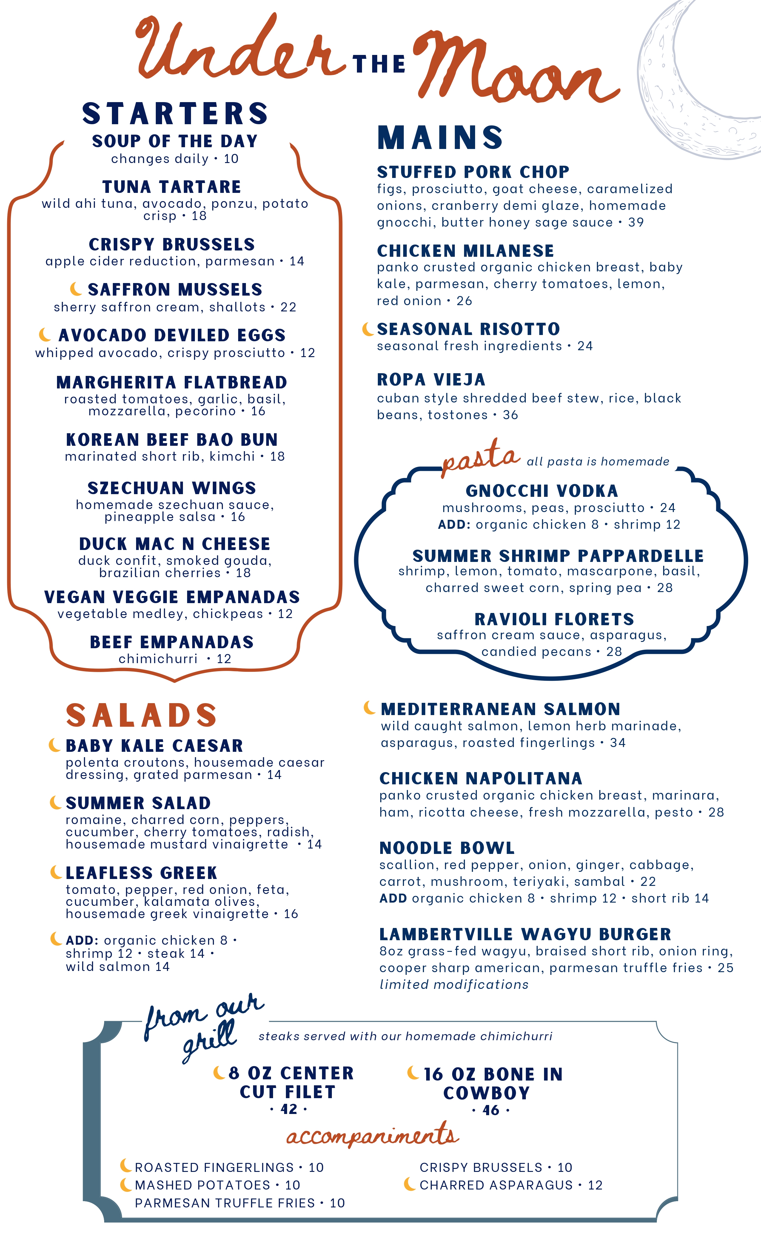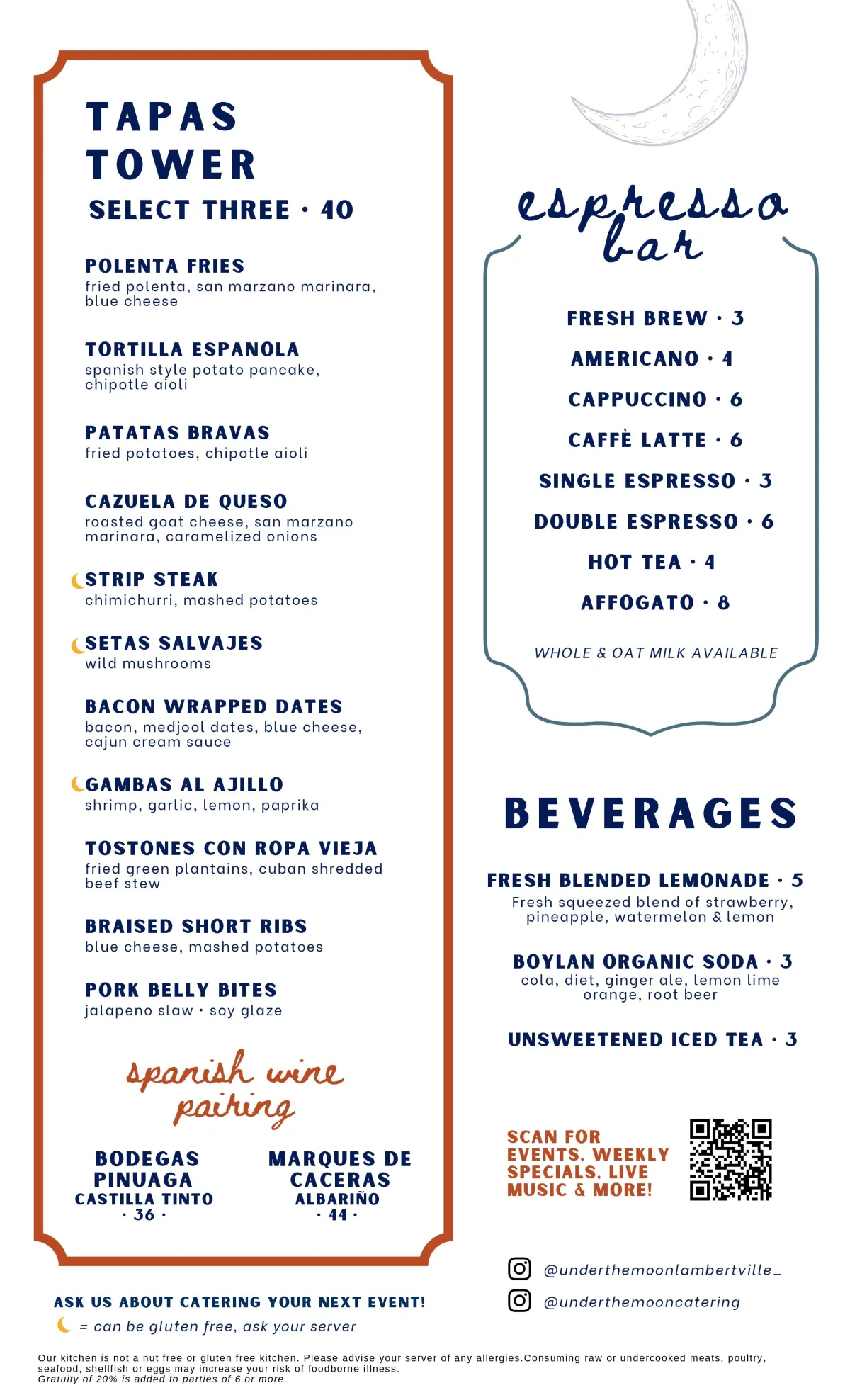 Under the Moon Café was born in 2006 from the desire of Estela Buontempo Orosco and Santiago Orosco to create a restaurant with a warm, welcoming atmosphere that offers home cooked style meals and the best desserts in Bordentown, NJ.
